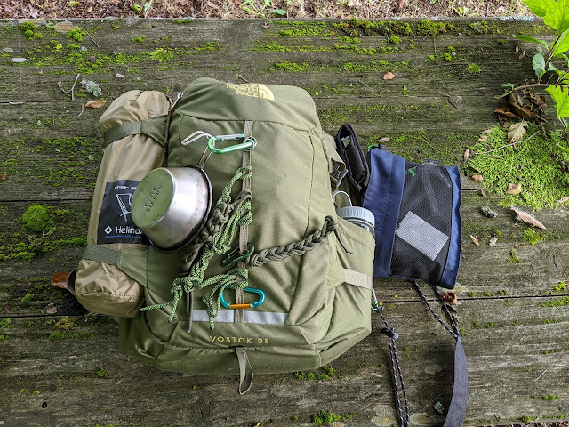 主な変更点はコッヘルを普通サイズのメスティン(なんちゃって品)とその中に入るダイソーメスティンに変えたこと、水筒を一つ減らして粉末飲料を減らしたこと、手斧を思い切って外したこと。